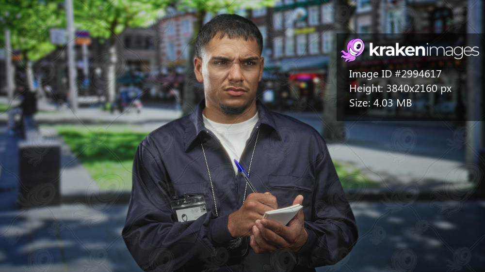 Man detective writing small notepad with blue pen on busy urban street, badge on chain and radio in jacket pocket visible; serious duty.