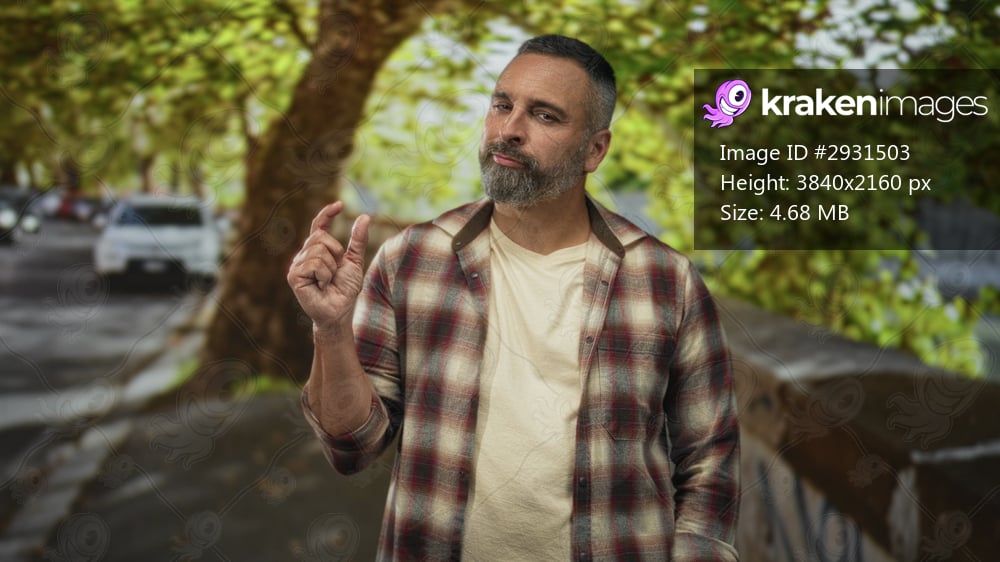 Man displaying a pinch gesture with one hand on a tree lined street near parked cars, wearing a plaid shirt and beard; quiet skepticism.