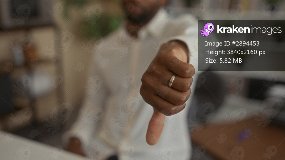 Man displaying thumbs up and thumbs down hand gesture with wedding ring in building; ambivalence decision.