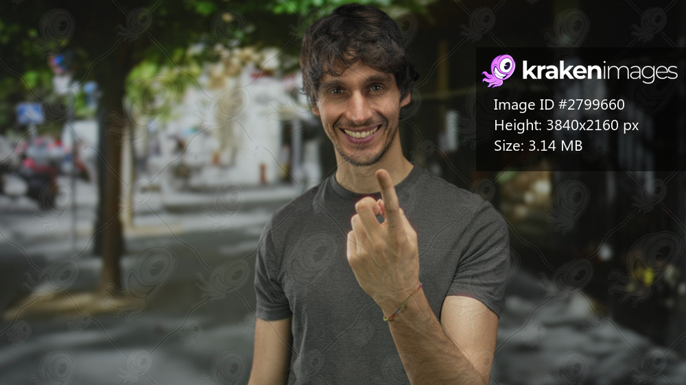 Man displays cheeky grin and shows middle finger in a shaded urban street lined with trees; defiance.