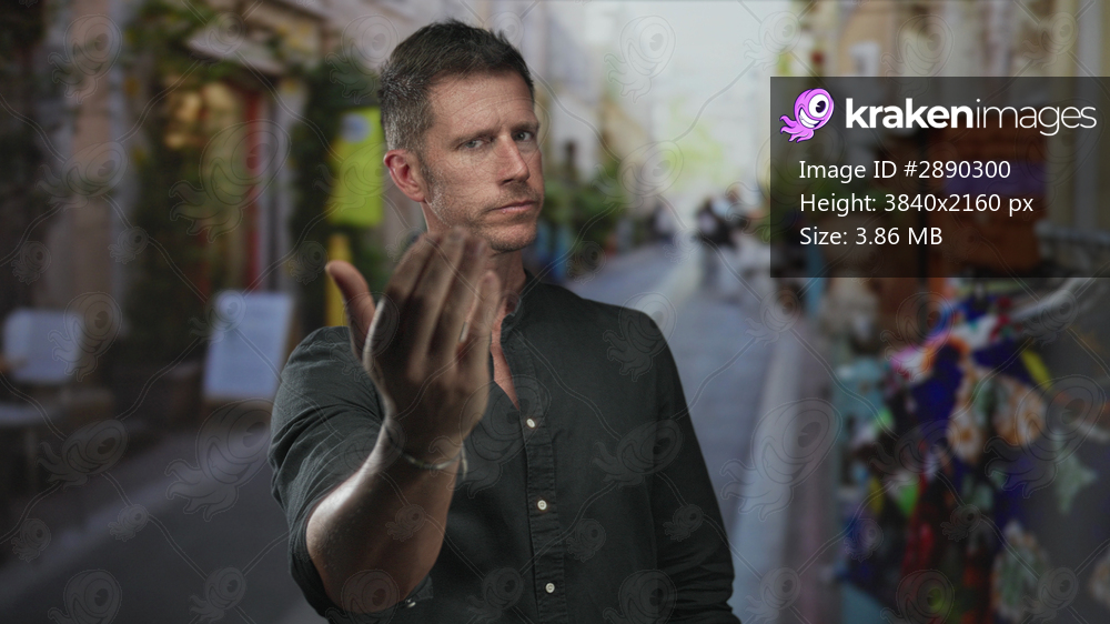 Man displays thumb up gesture on a narrow street, closeup of hand and face, wearing dark shirt and bracelet; confidence invitation.