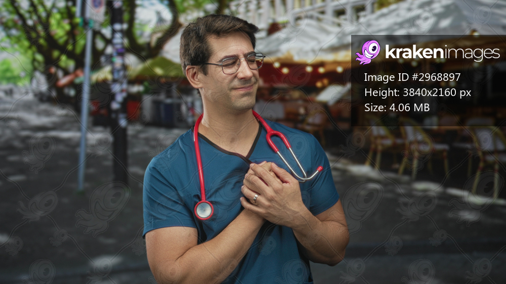 Man doctor clutching chest with red stethoscope on street cafe wearing glasses and wedding ring; concern duty.