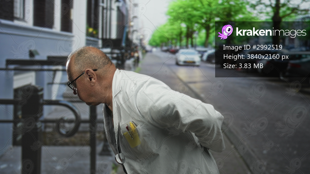 Man doctor coat with stethoscope and pens in pocket hand on lower back backache on street; concern resilience.
