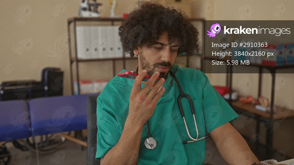 Man doctor holding phone to mouth with stethoscope in medical building; telemedicine consultation concern.