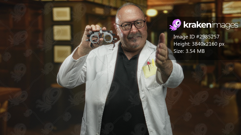 Man doctor holding phoropter trial frame with right hand and extending left hand toward camera in building interior; care trust.
