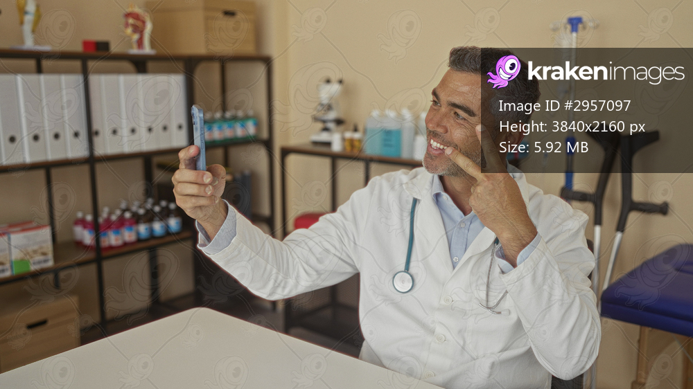 Man doctor holding smartphone and giving thumbs up while smiling in clinic building at desk; telemedicine reassurance.
