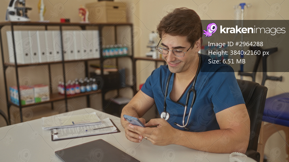 Man doctor holds smartphone and smiles in clinic building, stethoscope visible on his neck; calm reassurance.