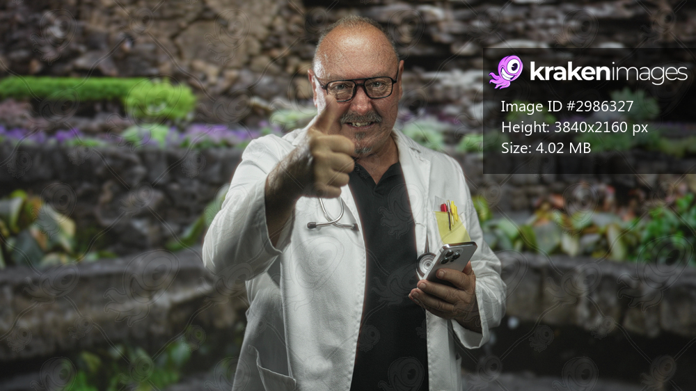 Man doctor in a white coat and stethoscope, senior hispanic, wearing glasses, gives thumbs up while holding smartphone inside a building; reassurance.