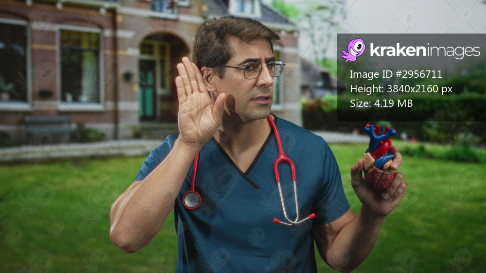 Man doctor in blue scrubs holds anatomical heart model and raises hand to ear in front of building; health awareness concern.
