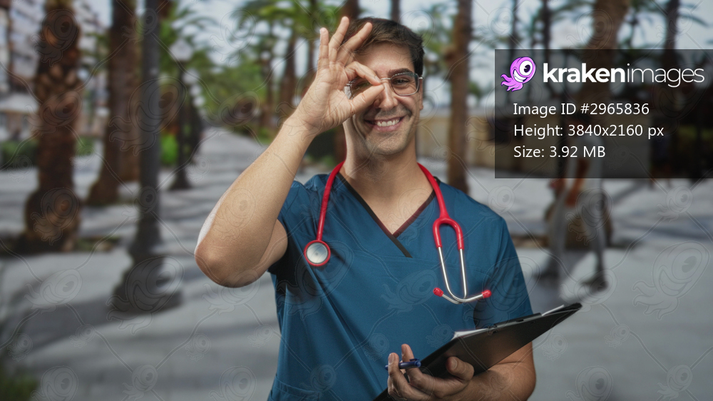 Man doctor in blue scrubs holds clipboard and makes ok sign by eye on a palm lined street; reassurance care.