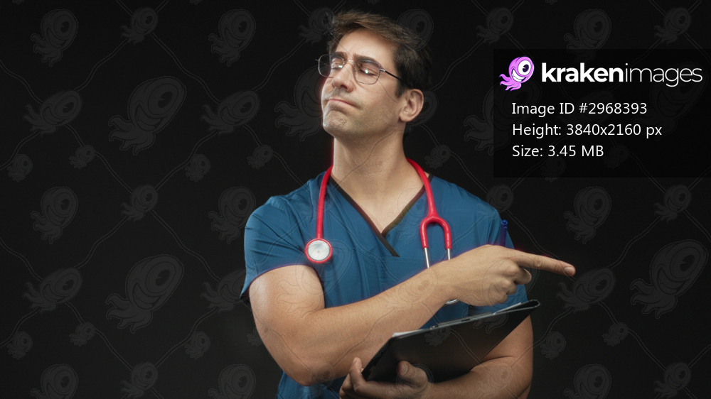Man doctor in blue scrubs points finger to right while holding clipboard in studio; confidence professionalism.
