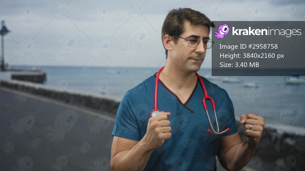 Man doctor in blue scrubs with red stethoscope clenches fists on seaside street; quiet thoughtful resolve.