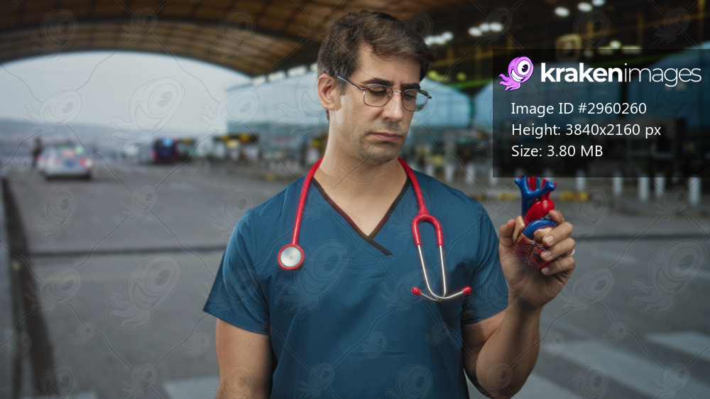 Man doctor in blue scrubs with red stethoscope holds anatomical heart model in right hand at airport terminal, looking pensive; concern.
