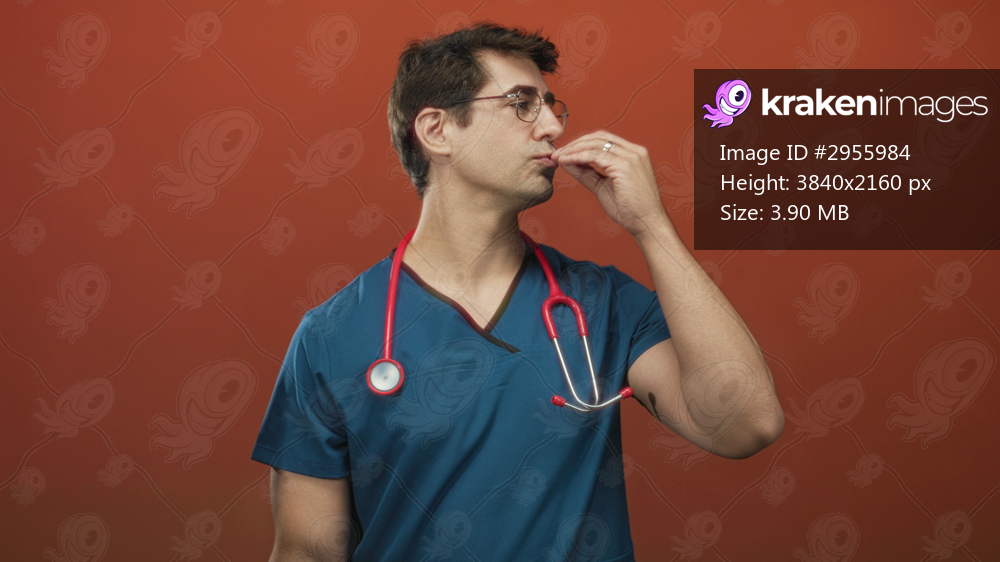 Man doctor in blue scrubs with red stethoscope pinches nose and rubs face, hand raised in studio; fatigue reflection.