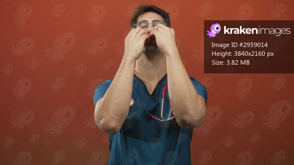 Man doctor in blue scrubs with red stethoscope pinches nose and rubs face, hand raised in studio; fatigue reflection.