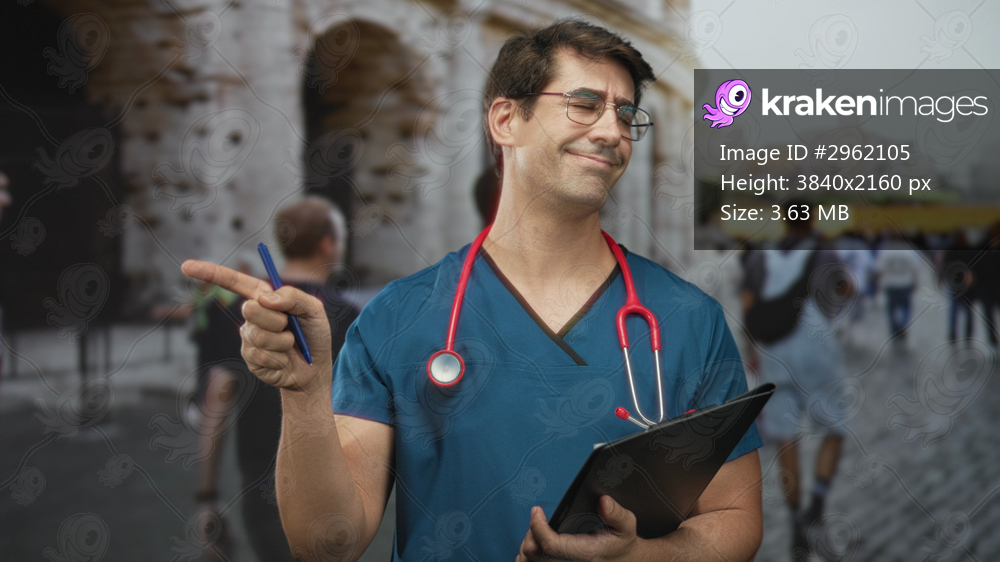 Man doctor in blue scrubs with red stethoscope pointing finger with pen while holding clipboard in front of an ancient building among tourists; calm confidence reassurance. - Kraken Images