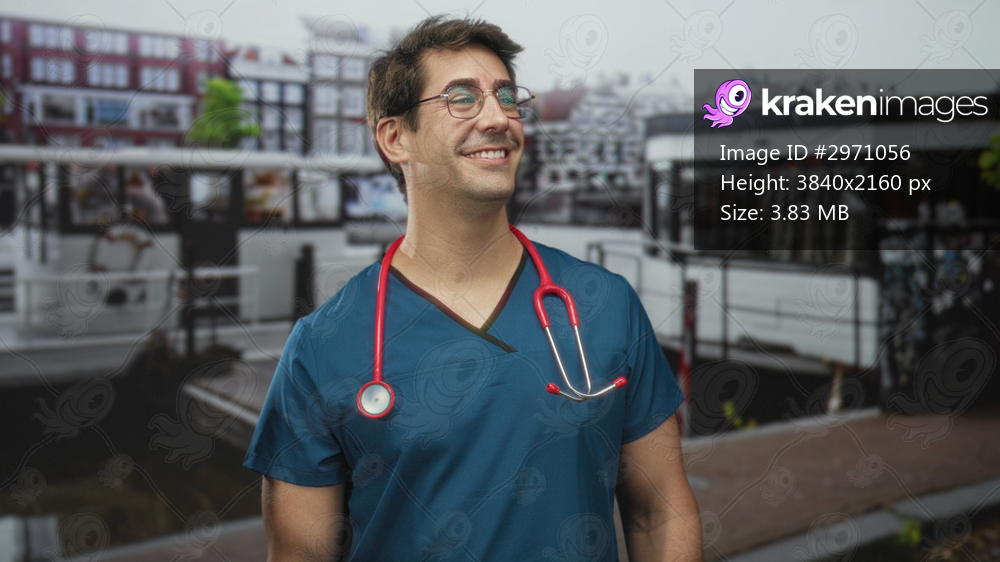 Man doctor in blue scrubs with red stethoscope smiling beside a canal boat on street; compassion care trust.