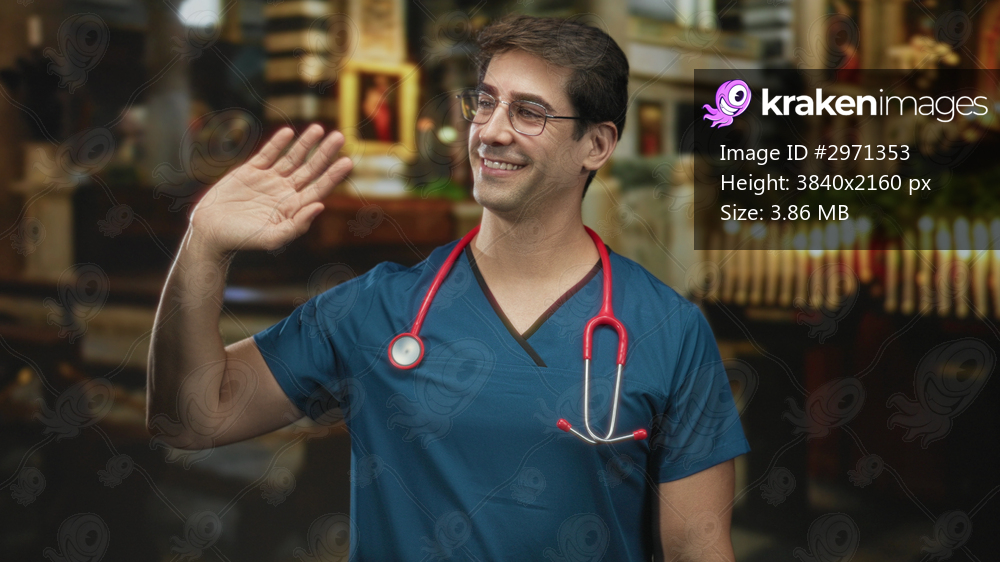 Man doctor in blue scrubs with red stethoscope waving right hand in ornate church interior with candles and paintings; compassion welcome.