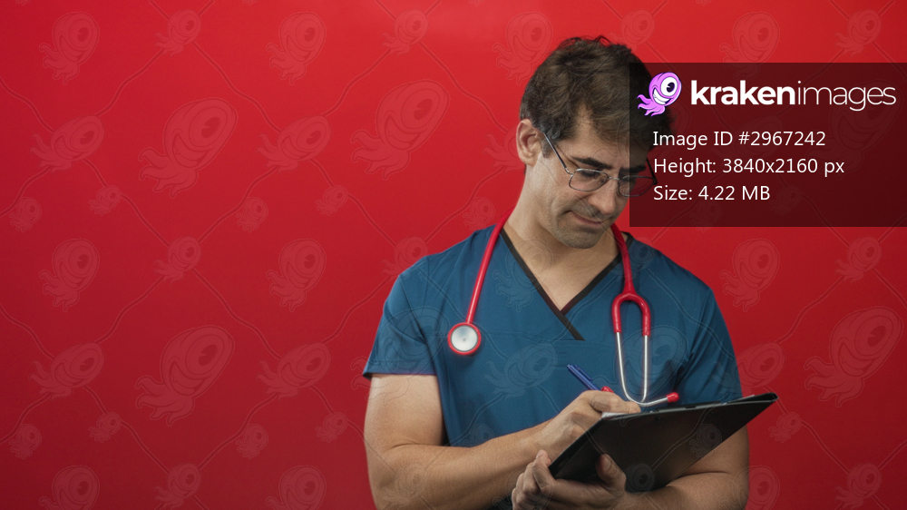 Man doctor in blue scrubs with red stethoscope writing on clipboard holding pen to lips studying chart in studio; contemplation.