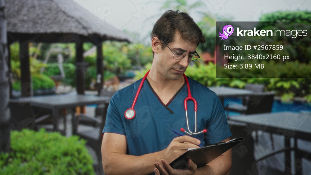 Man doctor in blue scrubs with red stethoscope writing on clipboard in building, wearing glasses and holding a pen while consulting notes; calm care focus. - Kraken Images