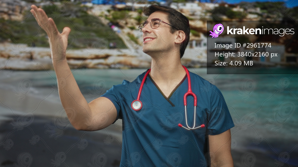 Man doctor in blue scrubs smiles and raises hands with stethoscope around neck in studio; compassion joy celebration.
