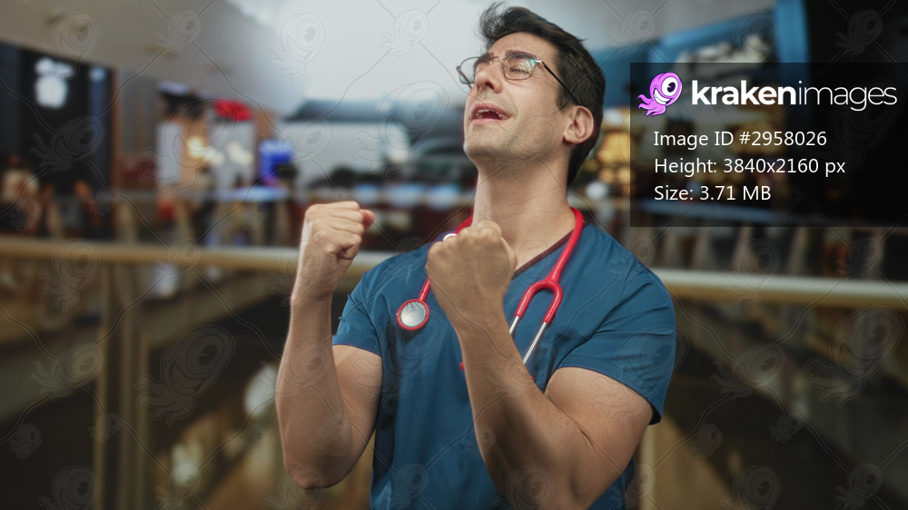 Man doctor in blue scrubs with stethoscope clenches fists in airport terminal near railing and storefronts; quiet triumph.