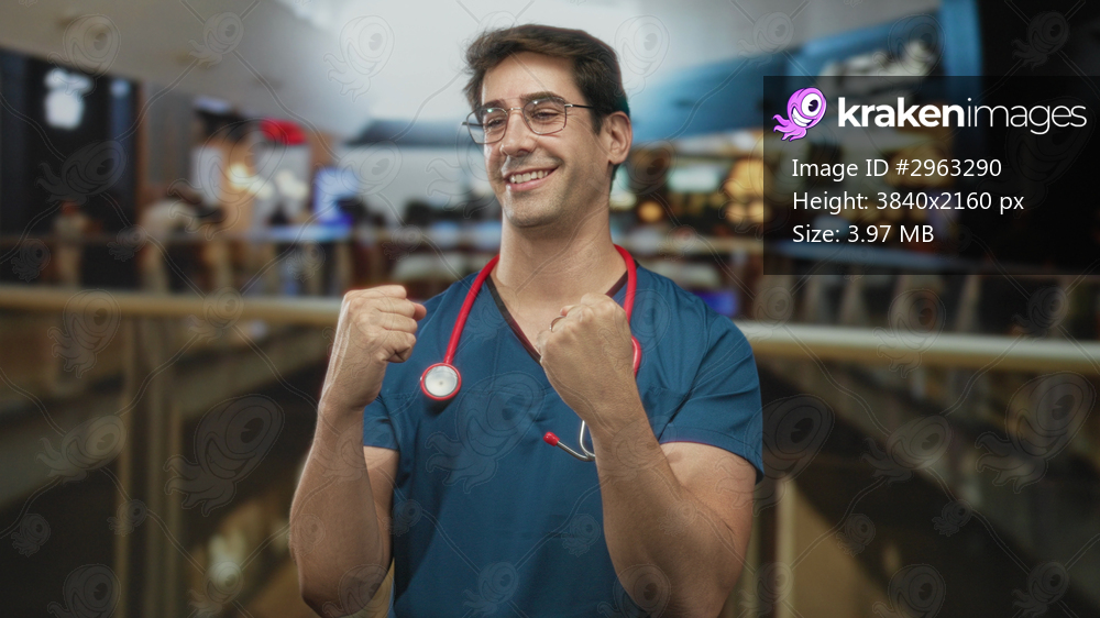 Man doctor in blue scrubs with stethoscope clenches fists in airport terminal near railing and storefronts; quiet triumph.
