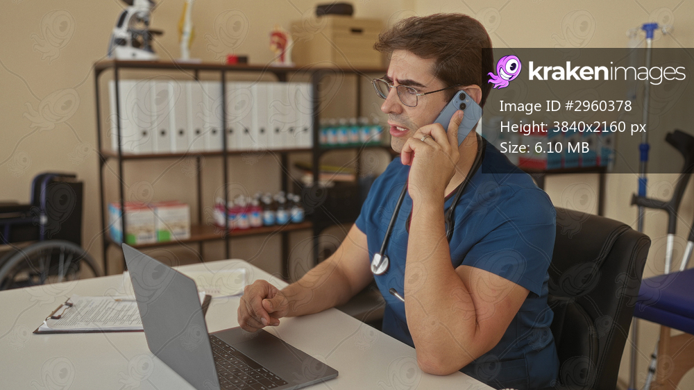Man doctor in blue scrubs with stethoscope holding phone to ear and typing on laptop at desk inside medical building; patient care concern.