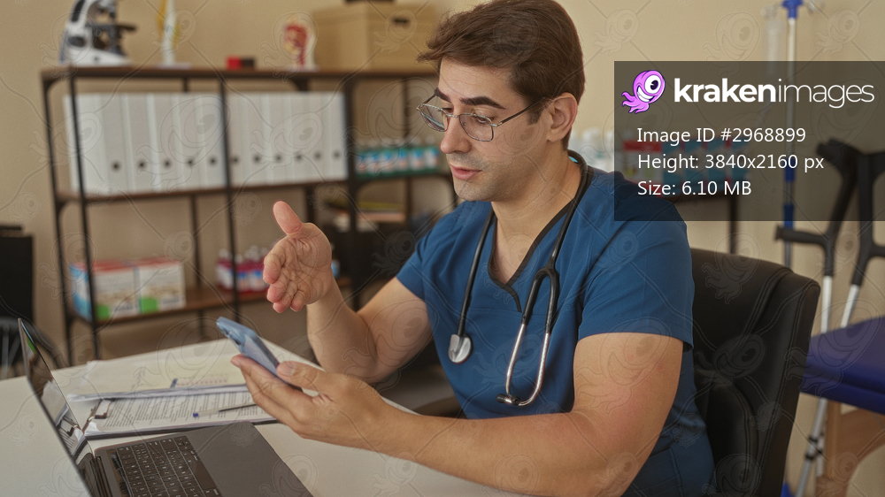 Man doctor in blue scrubs with stethoscope holding smartphone and gesturing with right hand while seated at desk in clinic building; focused care.