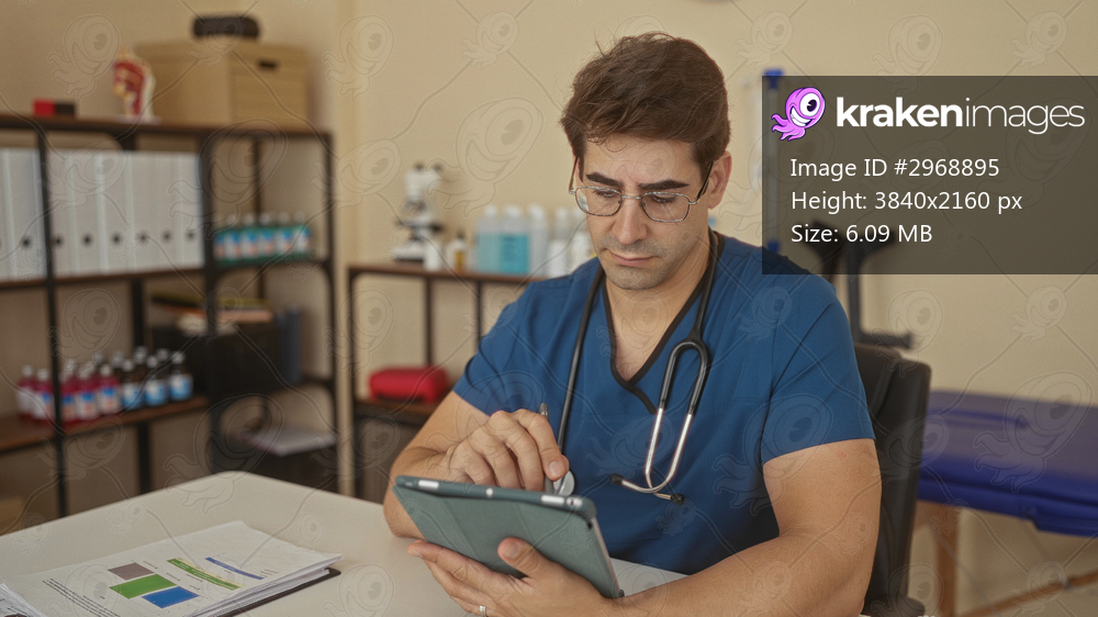 Man doctor in blue scrubs with stethoscope holding tablet and pen to chin, tapping screen in clinic building; clinical thinking concentration.