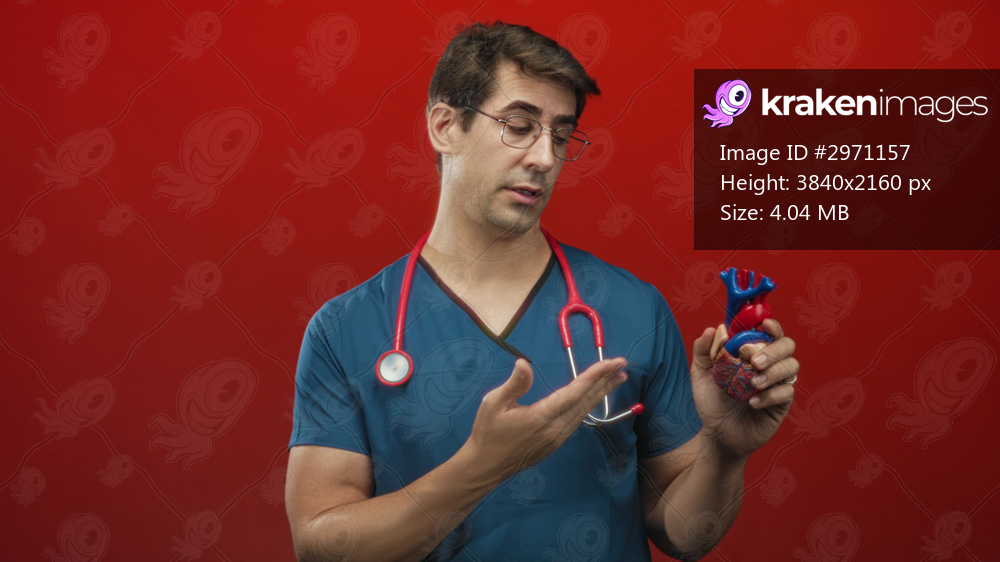 Man doctor in blue scrubs with stethoscope holds anatomical heart model and points with hand against red studio backdrop; informative education.