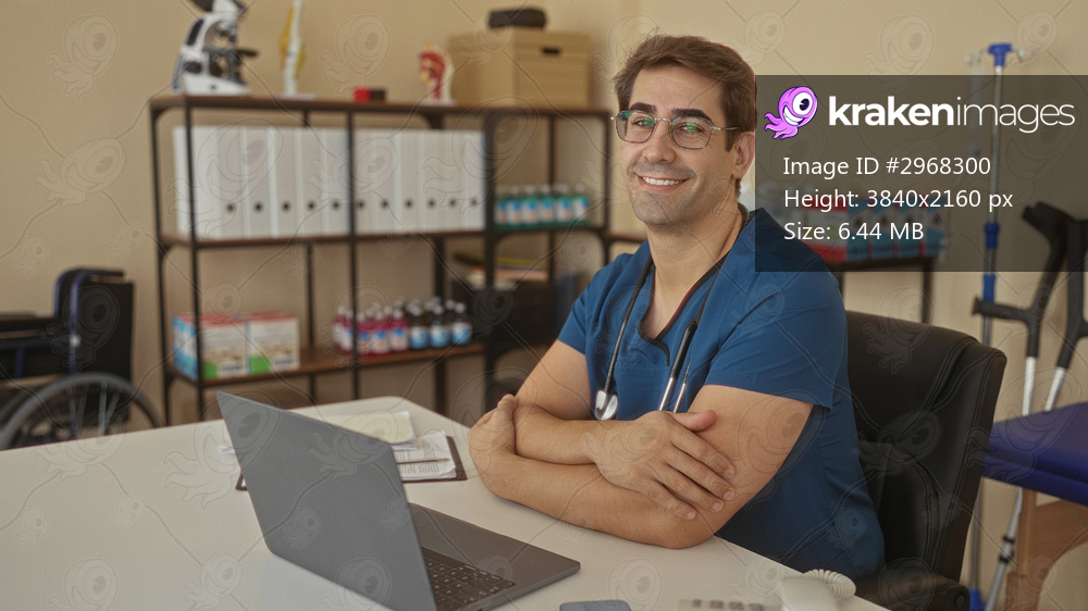 Man doctor in blue scrubs with stethoscope sitting at desk arms crossed smiling beside laptop and medical shelf in clinic building; trust wellbeing.
