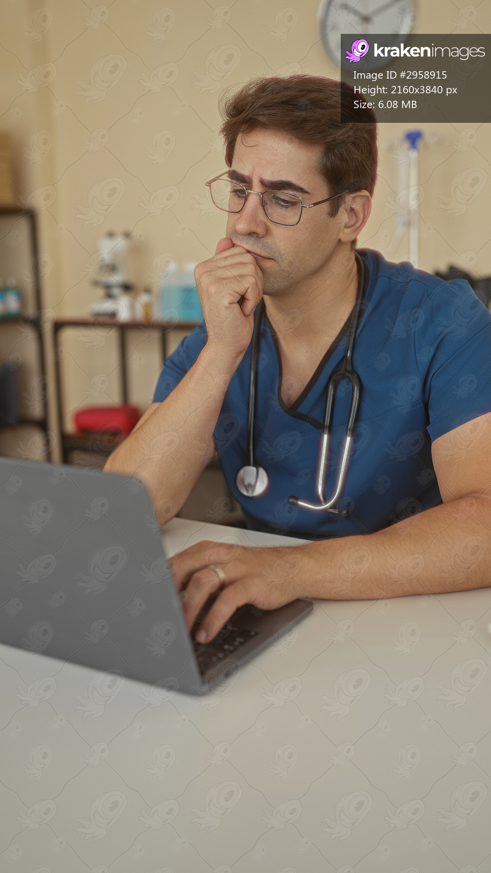 Man doctor in blue scrubs with stethoscope types on laptop while hand on chin in clinic building; thoughtful focus.