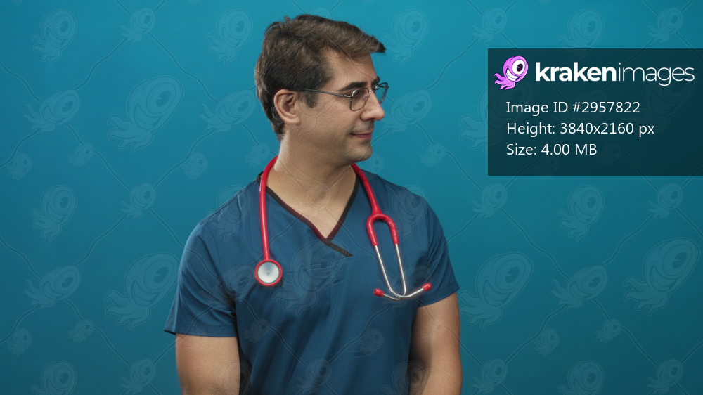 Man doctor in blue scrubs wearing stethoscope, shrugging with eyes closed and head tilted back in studio; fatigue compassion.