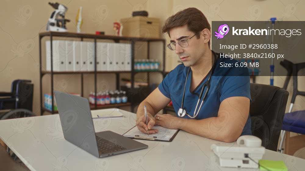 Man doctor in blue scrubs writes on clipboard with stethoscope and laptop inside clinic building, filling chart and documentation; focused care.