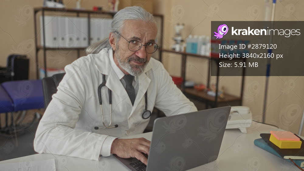 Man doctor in clinic wearing white coat and stethoscope types on laptop and points finger upward while seated at desk; trusted reassurance.