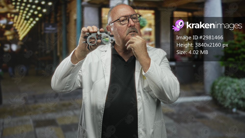 Man doctor in coat holds phoropter to eye with hand on chin on street; thoughtful reflection care health.