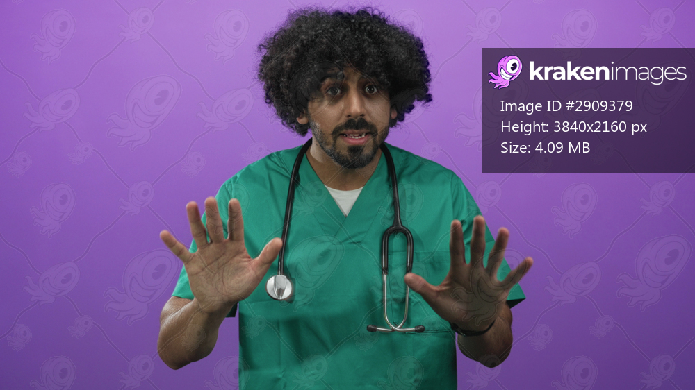 Man doctor in green scrubs with stethoscope holding palms forward as stop gesture in studio with purple backdrop; calm reassurance.