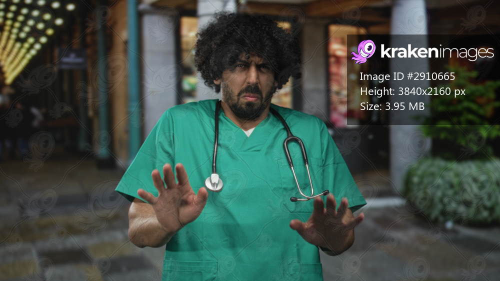 Man doctor in green scrubs with stethoscope holding palms out on street; concern fatigue hesitation.