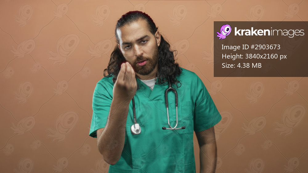 Man doctor in green scrubs with stethoscope making a pinched finger gesture in tan studio; skepticism diagnosis.