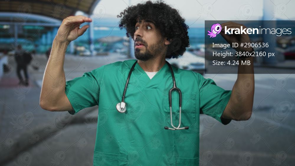 Man doctor in green scrubs with stethoscope raises hands in shrug at airport terminal; confusion uncertainty.