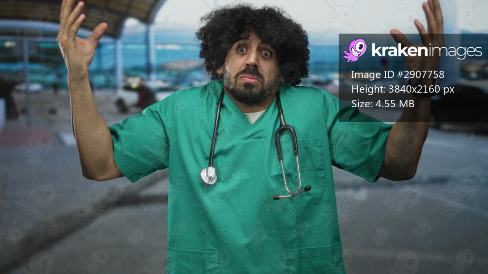Man doctor in green scrubs with stethoscope raises hands in shrug at airport terminal; confusion uncertainty.