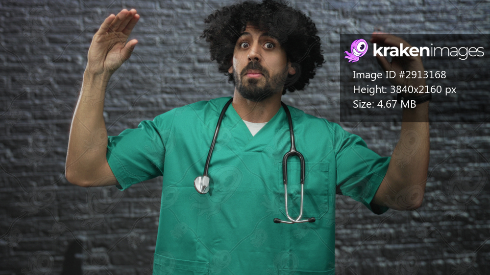 Man doctor in green scrubs with stethoscope raising hands in studio against brick wall; surprise uncertainty.