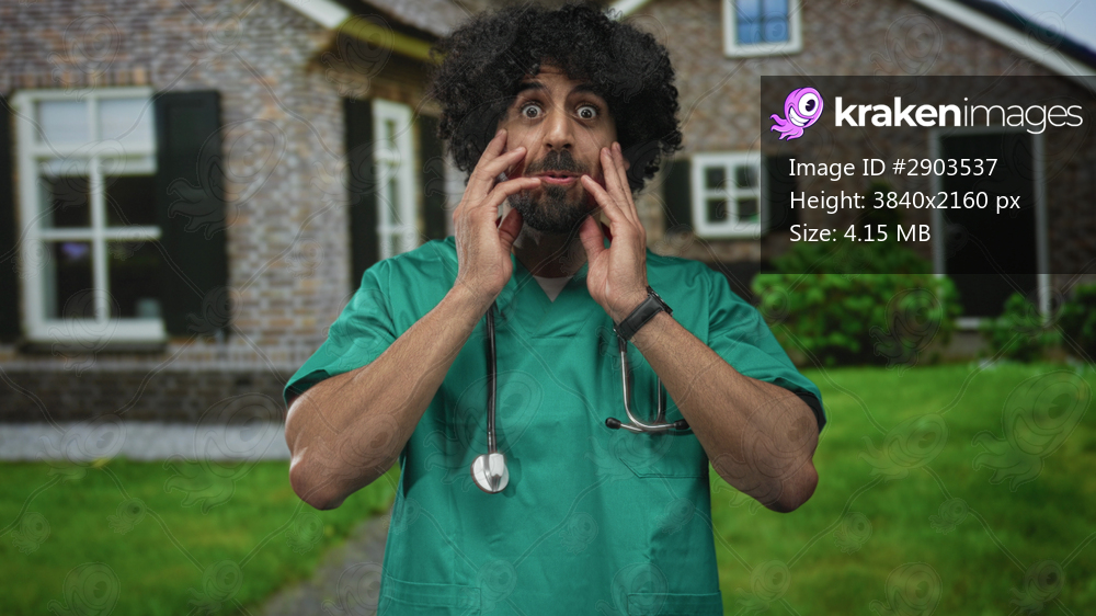Man doctor in green scrubs with stethoscope touching his cheeks at a building entrance on a house lawn and path; surprise.