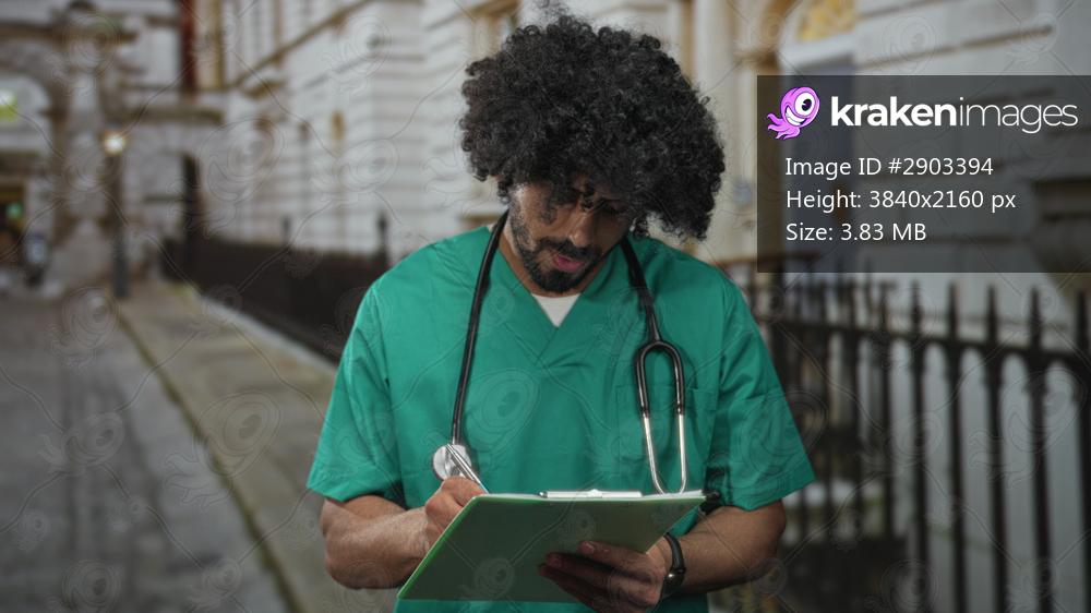 Man doctor in green scrubs with stethoscope writing on clipboard on city street near a building; duty care focus.