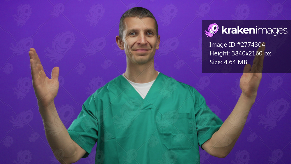 Man doctor in green uniform gesturing large size against purple isolated wall background, smiling, caucasian, professional, medical, healthcare, cheerful, confident, friendly. - Kraken Images