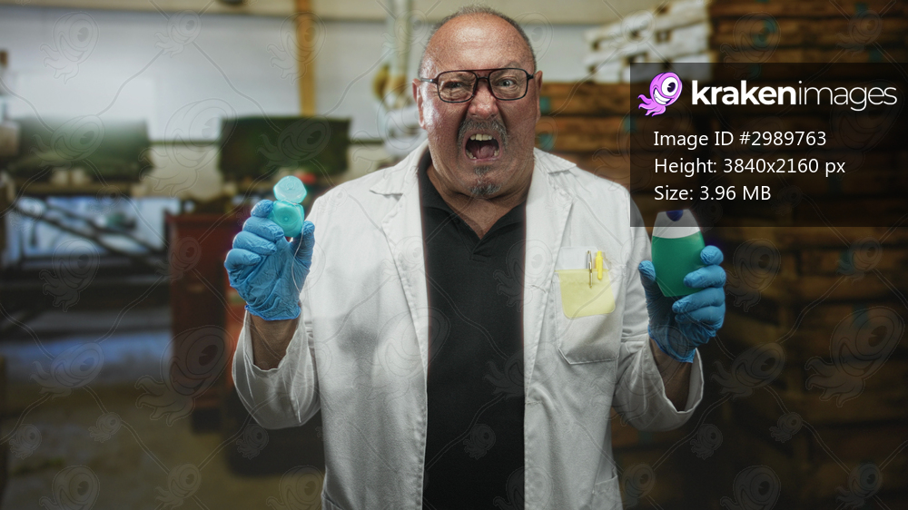 Man doctor in lab coat and gloves holding dental floss and toothpaste, grimacing with open mouth in building; dental care frustration.