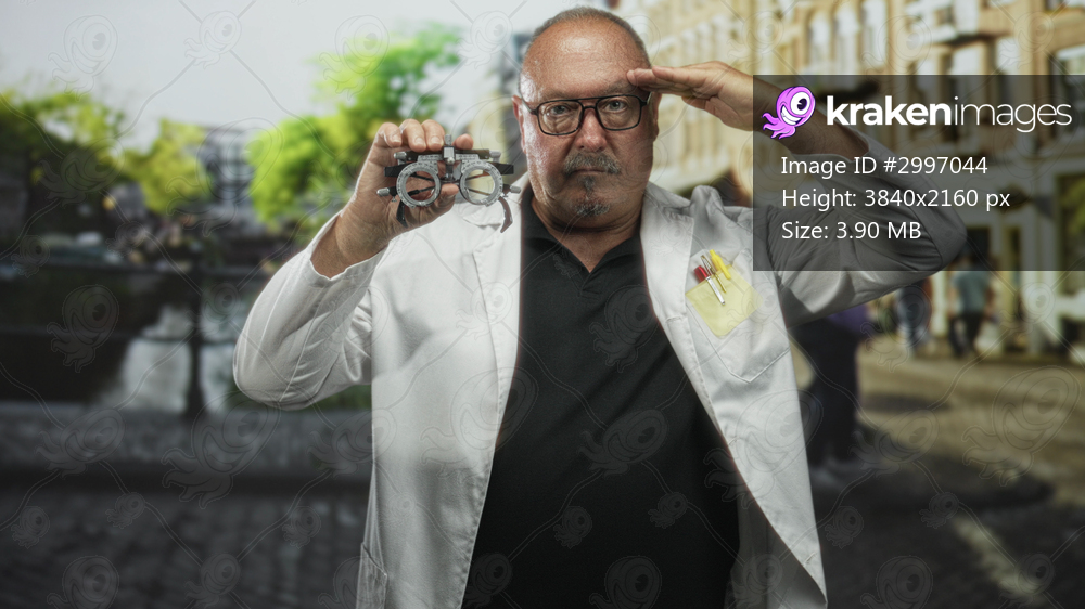 Man doctor in labcoat holds phoropter with left hand and places right hand to forehead on street; concentration care.