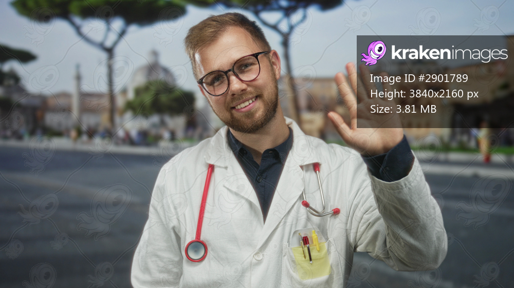 Man doctor in labcoat with red stethoscope smiling on a busy city street while wearing glasses and pens in pocket; compassion health support.