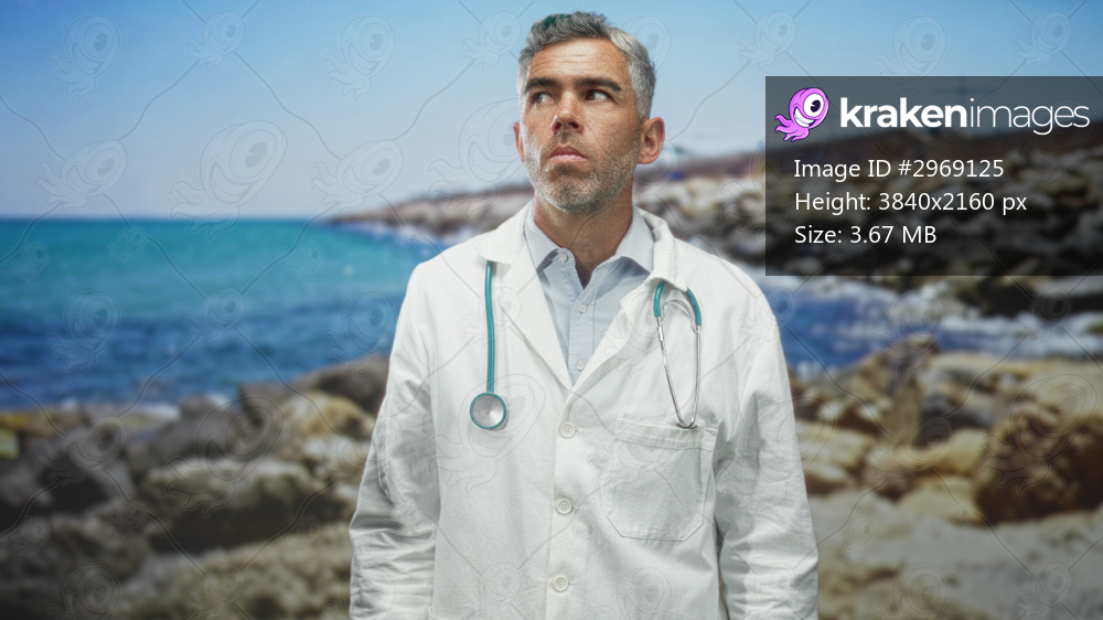 Man doctor in labcoat with stethoscope pressing hands to face, eyes closed against a studio beach backdrop with rocky shore; fatigue.